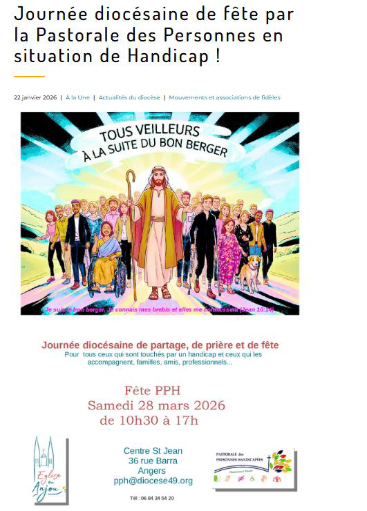 La Pastorale des Personnes Handicapées (PPH)est l’un des pôles du Service Santé-Solidarités de notre diocèse d’Angers. Elle participe à sa manière à la mission du Service Santé-Solidarités qui est de veiller, susciter et soutenir une attention personnelle et communautaire des chrétiens aux personnes porteuses de handicap ou de déficience ainsi que de leurs proches contraints d’adapter leur mode de vie.